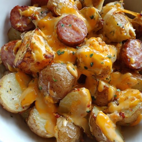 Yes, this recipe works well for prepping ahead with a bit of planning. You can fully assemble the potato, soup, sour cream, and first portion of cheese in the baking dish, then cover and refrigerate it for up to 24 hours before baking. When you’re ready to cook, let the dish sit at room temperature for about 20–30 minutes so it doesn’t go into the oven ice-cold, which can cause uneven baking. Bake as directed, but plan to add an extra 5–10 minutes to the first bake if it was well chilled. Wait to add the sausage and final cheese until the second bake so the sausage doesn’t dry out while reheating and the top cheese stays melty and fresh-looking.