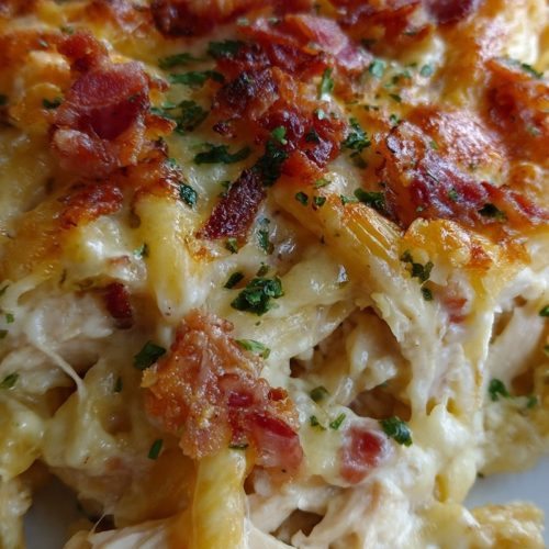 This Chicken Bacon Ranch Casserole is easy to prepare ahead, which is helpful for busy weeks. To assemble in advance, follow the recipe through step 5, then cover tightly and refrigerate for up to 24 hours. When baking from cold, add an extra 5–10 minutes to the oven time and check that the center is hot and bubbling. If the top browns too quickly, cover loosely with foil for part of the bake.