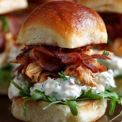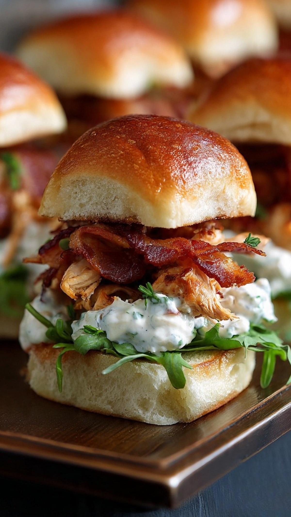 Soft slider rolls are filled with shredded chicken tossed in a creamy ranch mixture, sharp cheddar, and crispy bacon, then brushed with a garlicky butter and baked until golden—an easy, crowd-pleasing slider perfect for parties, game day, or weeknight dinners.