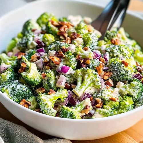 This creamy broccoli salad is built for entertaining. It holds up on a buffet table, it travels well, and it actually tastes better after it sits. I like to make it a few hours before guests arrive, then give it a quick toss before serving so the dressing wakes back up. It’s the kind of side that quietly steals attention away from the mains.