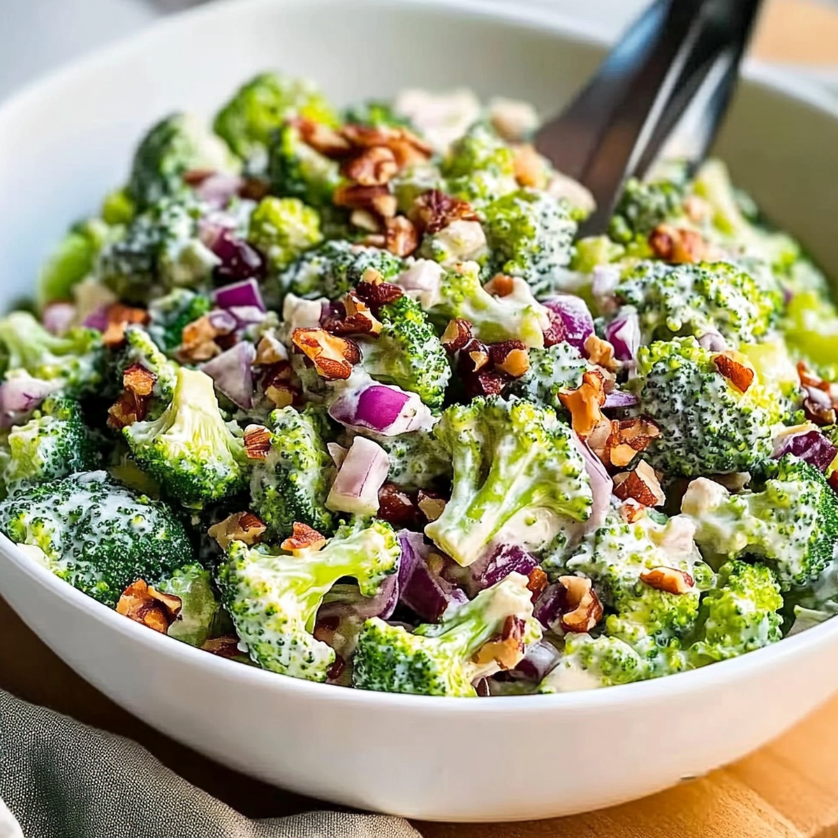 If your broccoli salad has turned watery before, the main culprit is usually excess moisture from the broccoli or onions. Make sure the broccoli is completely dry after washing—use a salad spinner or pat it well with towels. Dice the red onion small so it blends in but doesn’t release big watery chunks. Chill the salad at least an hour, then give it a good stir right before serving so any moisture gets redistributed into the dressing instead of pooling at the bottom of the bowl.