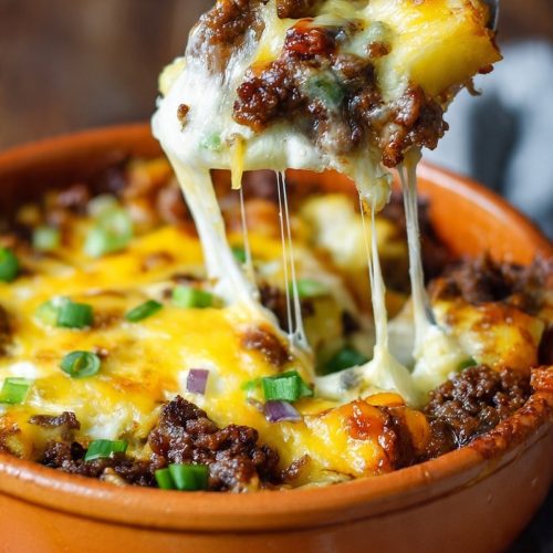 Yes, you can assemble it in advance with a few adjustments. Brown and season the ground beef, then let it cool completely. In the slow cooker insert (or a separate bowl), combine the cooked beef, hash browns, soup, 1 cup cheese, sour cream, salsa, and any add-ins. Cover and refrigerate up to 24 hours. When you’re ready to cook, let the insert sit at room temperature for 20–30 minutes so it’s not ice-cold, then sprinkle on the remaining cheese and cook. Plan on adding 30–45 minutes to the cook time since everything starts cold.