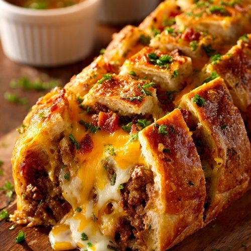 I like this recipe for busy nights or game days when I don’t want to fuss with multiple pans and sides. Everything goes into one rolled loaf that you slice and serve. You still get the bacon, onion, and ground beef combo, but you’re not locked into processed cheese or heavy toppings. You can swap in better-quality cheese, dial back the mayo in the sauce, or boost the vegetables without losing that classic “burger-in-bread” feel.