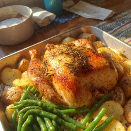 This recipe is a good way to cook once and eat more than once if you plan for leftovers. After dinner, remove the remaining meat from the bones while the chicken is still slightly warm; it comes off more easily. Store the meat and vegetables in separate airtight containers in the fridge. The chicken works well in salads, grain bowls, or quick sandwiches the next day. You can also simmer the bones with vegetable scraps and water for a simple stock; keep it at a gentle simmer, not a rolling boil, for clearer broth. This approach stretches one roast chicken into several meals and cuts down on food waste.