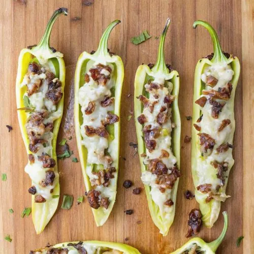 - 10 banana peppers halved lengthwise and cored (use more if peppers are small)
